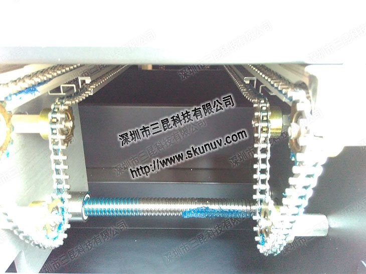 10、保证光固化机器各活动部位的润滑,主被动托辊、轴承,链条和传动轮应每半年上一次黄油;其他部位及电机一年一次,前后辊、托辊和传动网咬合部分不允许使用任何润滑脂。